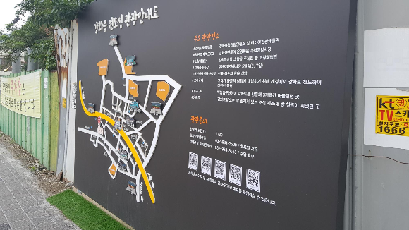 길을 건너 에어컨 실외기가 회랑처럼 늘어선 곳을 지나 걸어가면 주출입구와 강화도 원도심관광안내도가 있다. 관광안내도는 카페 사장이 설치한 것이 아니라 공무원들이 나같은 옥외광고업자에게 맡겨 설치한 냄새가 난다.