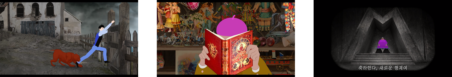 그러나 감독은 역으로 작품의 중간에 ‘마스터맨’ 및 그 일당이 네 발로 있는 모습을 보여주면서(그림12) 정작 짐승으로 비유되는 열등한 개체가 마스터맨과 그 일당임을 알려준다. 극의 초반 오렐이 광견병 개를 발로 차는 장면과 극의 후반 마스터맨 일당을 발로 차는 장면을 같은 구도로 표현하여(그림13) 그 둘이 같은 존재임을 암시하며, 극의 후반부 ‘마스터맨’은 본인 스스로 걷지 못해 본인의 ‘네 발’이라고 일컫는 여성들 네 명에게 의존한다.(그림14)