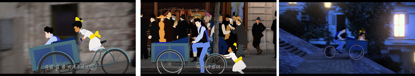 ‘파리의 딜릴리’(그림1)는 벨에포크 시대의 파리를 배경으로 하는 프랑스의 애니메이션 거장 미셸 오슬로 감독의 장편 애니메이션으로서 시대적 배경을 보여주기 위해 그 시대의 장소(그림2) 및 실존 인물을 등장시킨다. 특히 파리의 유서 깊은 장소들을 보여주면서 이야기를 자연스럽게 연결하기 위해서 등장인물들이 각 장소들로 이동을 해야하는데, ‘파리의 딜릴리’에서는 장소의 물리적인 거리를 극복하기 위해 빠른 이동을 하게 해주는 다양한 이동 수단이 등장한다.