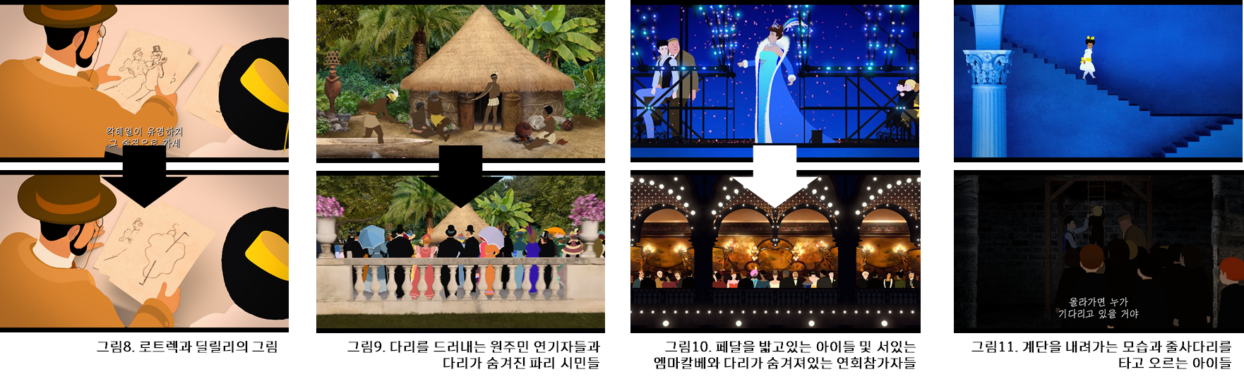 작품의 시작하는 장면에서 원주민 연기자들은 다리를 드러내지만 그것을 관람하는 비인도적인 사람들은 다리를 감추며 등장하는 시퀀스는 이 작품에서 다리의 상징성을 나타낸다. (그림9) 마찬가지로 작품의 후반부 주인공 일행이 여자 아이들을 구출해낸 시퀀스에서는 행동하지 않고 연회를 즐기는 사람들도 다리를 드러내지 않는 연출을 보인다. (그림10) 또한 두 다리는 수직으로 이동할 수 있는 특징을 보여준다. (그림11)