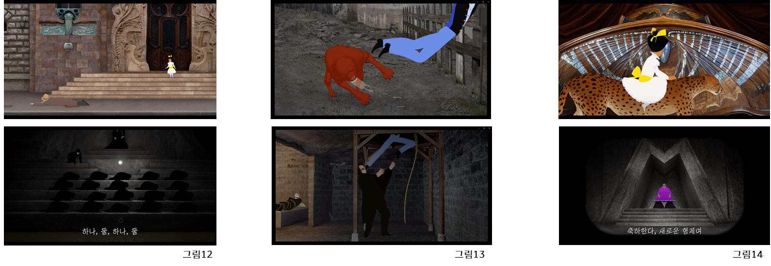그러나 감독은 역으로 작품의 중간에 ‘마스터맨’ 및 그 일당이 네 발로 있는 모습을 보여주면서(그림12) 정작 짐승으로 비유되는 열등한 개체가 마스터맨과 그 일당임을 알려준다. 극의 초반 오렐이 광견병 개를 발로 차는 장면과 극의 후반 마스터맨 일당을 발로 차는 장면을 같은 구도로 표현하여(그림13) 그 둘이 같은 존재임을 암시하며, 극의 후반부 ‘마스터맨’은 본인 스스로 걷지 못해 본인의 ‘네 발’이라고 일컫는 여성들 네 명에게 의존한다.(그림14)