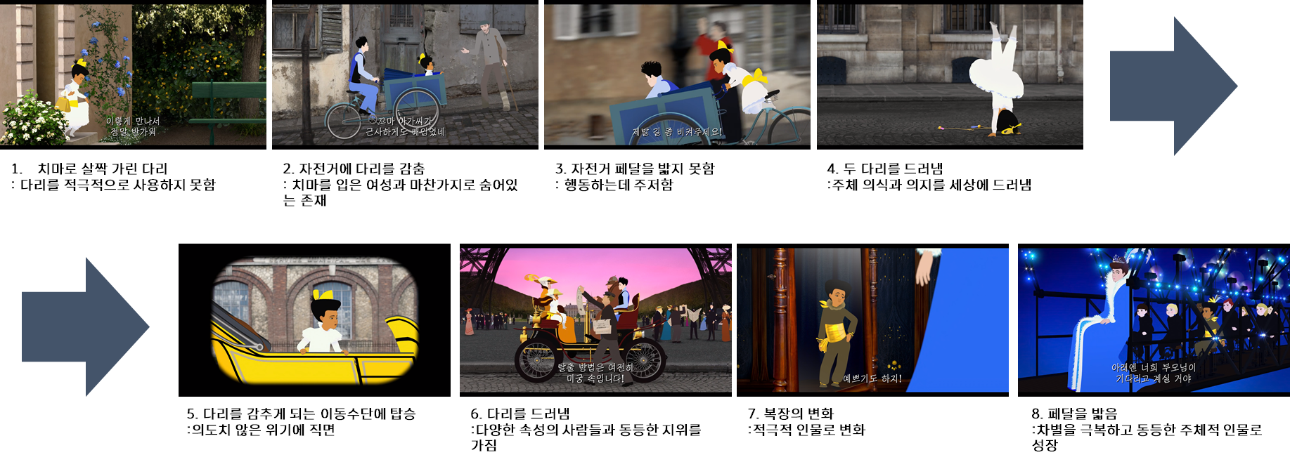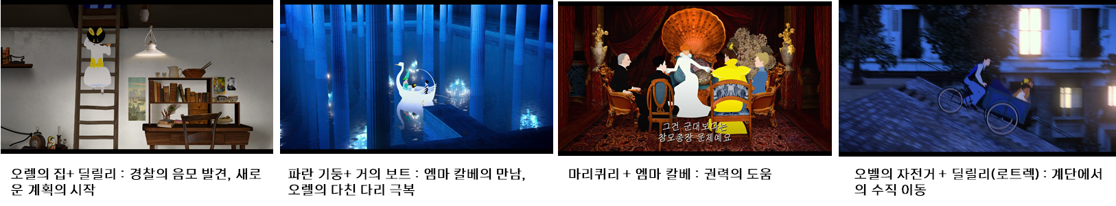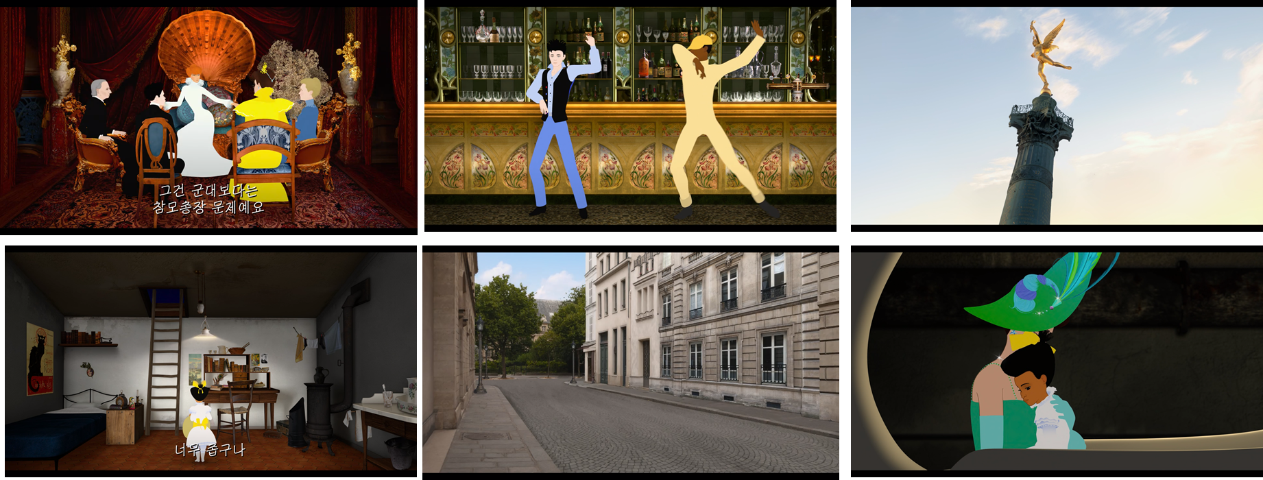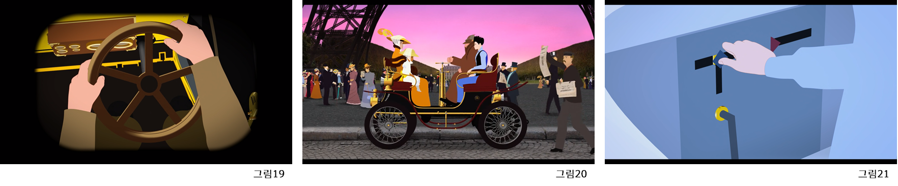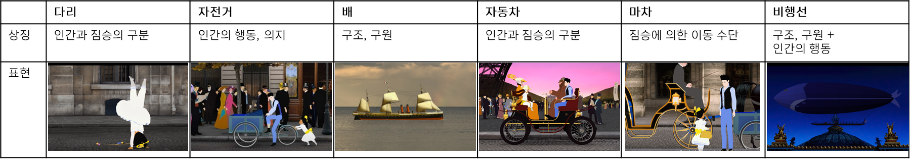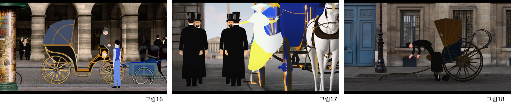 ‘파리의 딜릴리’(그림1)는 벨에포크 시대의 파리를 배경으로 하는 프랑스의 애니메이션 거장 미셸 오슬로 감독의 장편 애니메이션으로서 시대적 배경을 보여주기 위해 그 시대의 장소(그림2) 및 실존 인물을 등장시킨다. 특히 파리의 유서 깊은 장소들을 보여주면서 이야기를 자연스럽게 연결하기 위해서 등장인물들이 각 장소들로 이동을 해야하는데, ‘파리의 딜릴리’에서는 장소의 물리적인 거리를 극복하기 위해 빠른 이동을 하게 해주는 다양한 이동 수단이 등장한다.