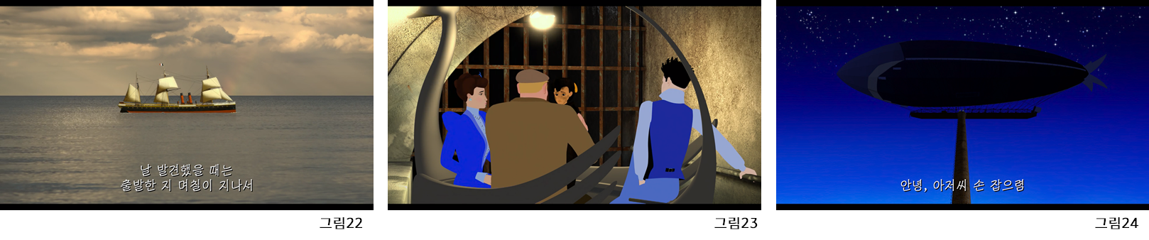 딜릴리는 배가 미셸 백작 부인으로 부터 배에서 발견되어 교육 받으며,(그림22) 마스터맨에게 납치되었을 때는 엠마 칼베의 배로 구출된다.(그림23) 또한 배의 형상을 한 작품의 후반부 비행선은 모든 납치된 어린아이들을 구출하는 방주의 형상으로 등장한다.(그림24) 즉 이 작품에의 배의 역할은 구조와 구원의 상징으로 묘사된다고 할 수 있다.