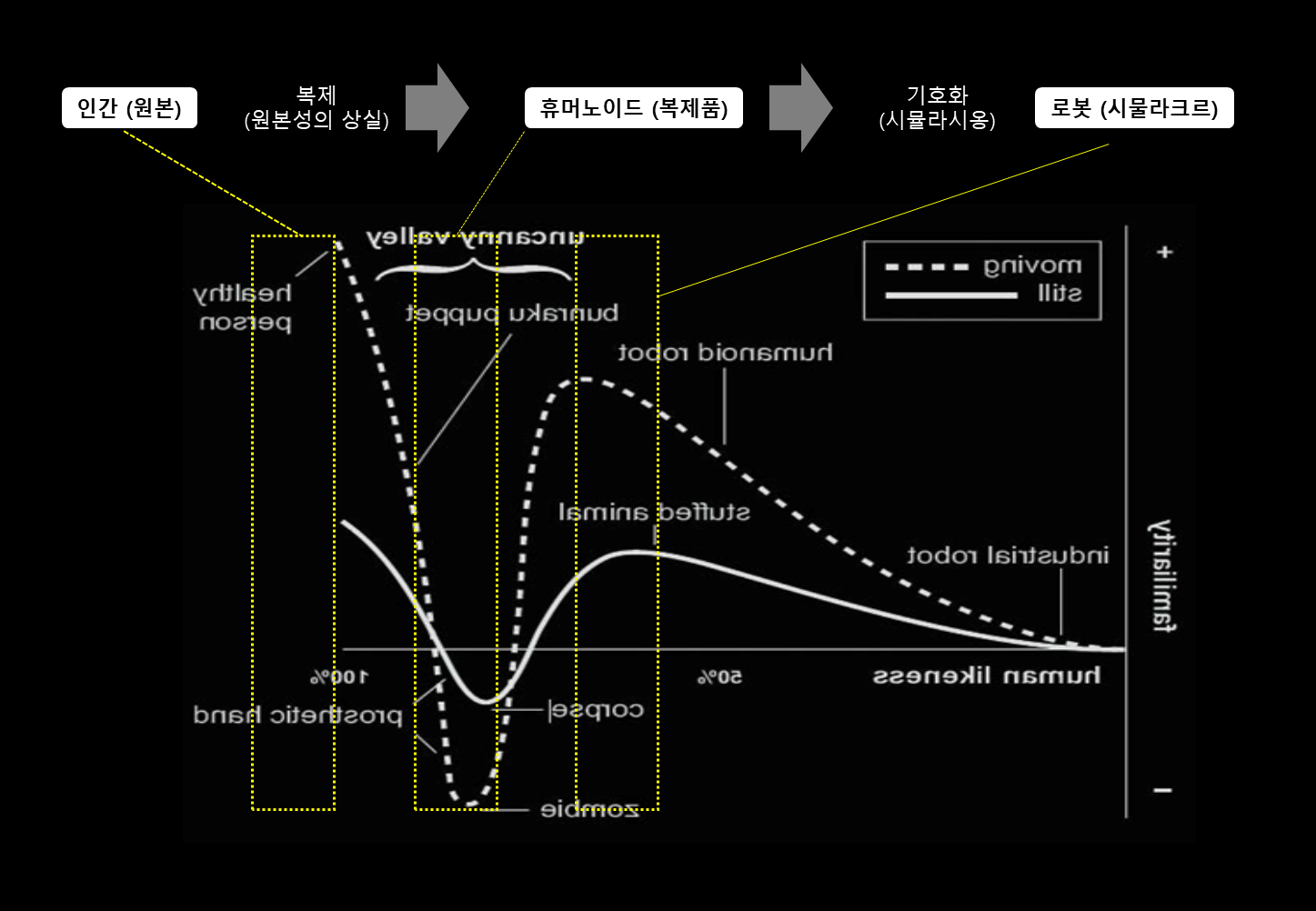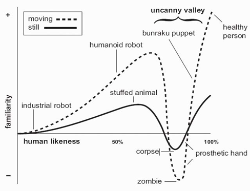 모리 마사히로가 제시한 그래프는 산업용 로봇부터 인간까지 연속적인 그래프이다. 그런데 Uncanny valley현상은 인간이 되기 직전의 단계 또는 구간에서 등장한다.