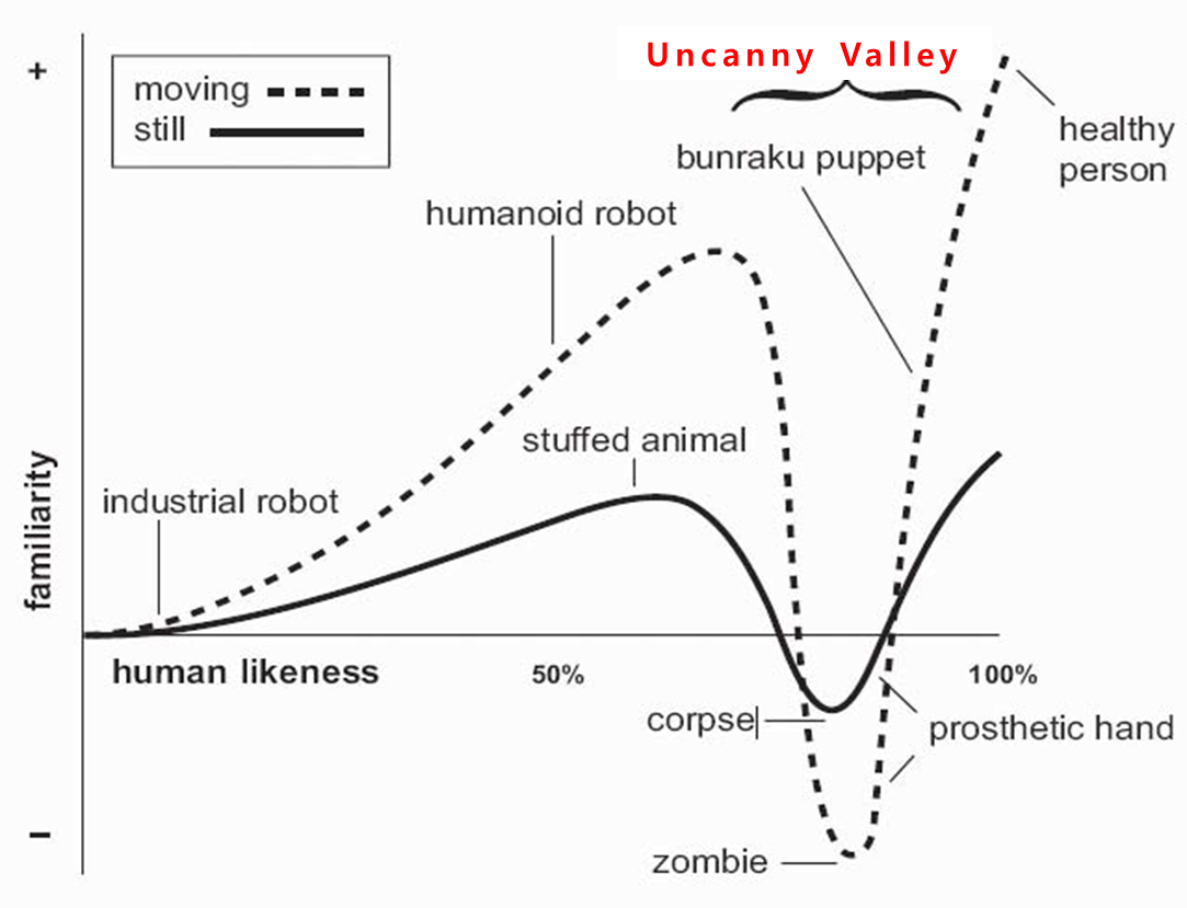 모리 마사히로가 주장한 Uncanny Valley(불쾌한 골짜기)이론은 인간을 모티브로한 로봇이나 CG가 점차 인간의 형상을 닮아 갈수록 사람들이 호감을 느끼는 정도가 올라가나, 닮은 정도가 일정한 지경에 이르면 오히려 호감도가 급격히 감소하는 구간이 있다는 이론이다. 이론에서 이야기하는 ‘인간의 닮음의 정도’는 구체적으로 정량화 된 것이 아닐 뿐 아니라, 이 이론이 참이냐 거짓이냐는 여러 실험을 통해 논란이 되어왔다.